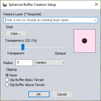 Created from a selected point feature, a spherical buffer creates a sphere with the radius measured outwards from the input point. The created mesh can be clipped to the terrain.