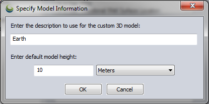 To add a new custom model click this button and select the 3D Model file that you would like to use as a 3D Point Symbol. Global Mapper supports common 3D file formats for point styles such as OBJ, sketchup, DAE, and STL. Once the file for the 3D Model has been selected you will be prompted to enter a model description and default model height and unit.