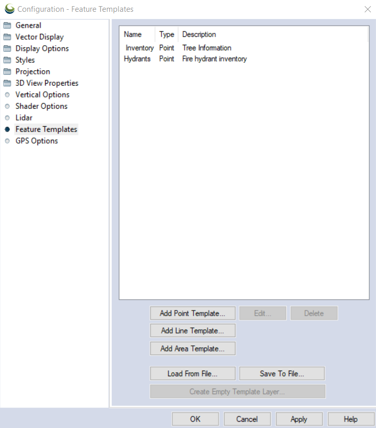 The Feature Templates section of the Configuration allows for the creation of templates for vector features so that they conform to a predefined set of feature properties and attribute values.