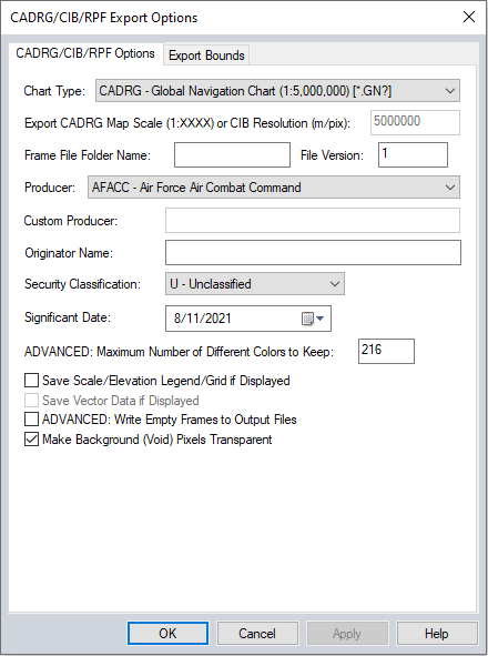 Export CADRG Map Scale (1:XXXX) or CIB Resolution(m/pix) - This option becomes available when the chart type specifies various resolutions. Enter the resolution value to specify the resolution in the output. The export will report the actual scale exported, rather than 'Various'.
