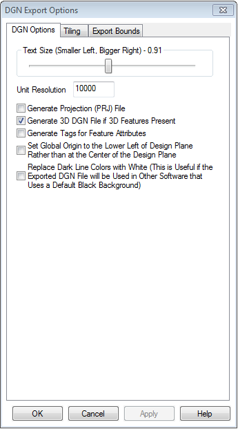 When selected, the command displays the DGN Export Options dialog (pictured below) which allows the user to set up the export. The dialog consists of a DGN Options panel, a Tiling panel, and an Export Bounds panel which allows the user to set up the portion of the loaded vector data they wish to export.