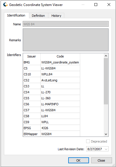 The information window for a Coordinate System, will display the EPSG code (if available) the Identification tab and specific information about the Coordinate System's geographic Envelope (region), Point Style, Datum, Projection and Parameters can be found on the Definition tab.