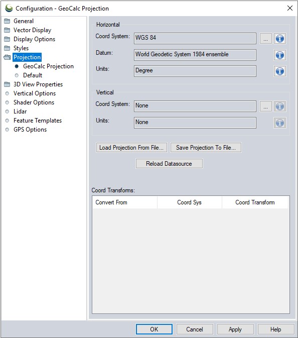 To perform a Projection change or Coordinate Transformation using the Geographic Calculator datasource, go to the Projection section of the Configuration menu. When GeoCalc mode is enabled, this menu will have been updated to reflect the additional functionalities and options.