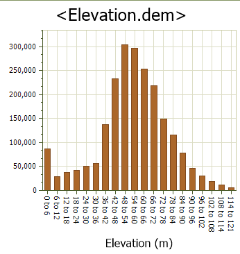 of numeric, then the graph will contain a bar for each value. When the data is an elevation layer, the elevation values will be grouped into bins, and each bin will be a bar in the graph. Note: To generate a histogram from raster data, go to the layer Metadata. |