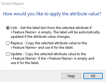 When creating labels, whether as a separate layer or not, there are three options to choose from regarding how the chosen attribute value for the vector data will be applied to the label. These options will appear in a pop-up window (shown below) after any changes in the Labels tab are applied, or after OK is clicked.