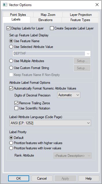 If enabled, this option will create a separate Label Layer that will contain all of the labels. Creating a separate label layer allows for much greater control over the location and style of the labels, and makes it so that they can be selected and manipulated with the Digitizer tool. Any settings in the original Labels tab will be used to define the label layer, but once it is created, the Labels tab will disappear, and those settings will instead be available in the Vector Options window for the new, separate label layer.