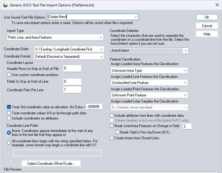 Feature Classification - use this section to specify what feature type to assign to area, line, and point features imported from the file or the Lidar classification to assign to Lidar features.