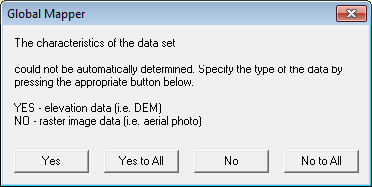 Global Mapper recognizes many raster file formats, but can not always determine if the file represents elevation data or imagery. The following dialog will appear for some data when the type can not be determined, asking to specify the characteristics of the data set. This typically has to do with the bit depth and number of bands in the file.