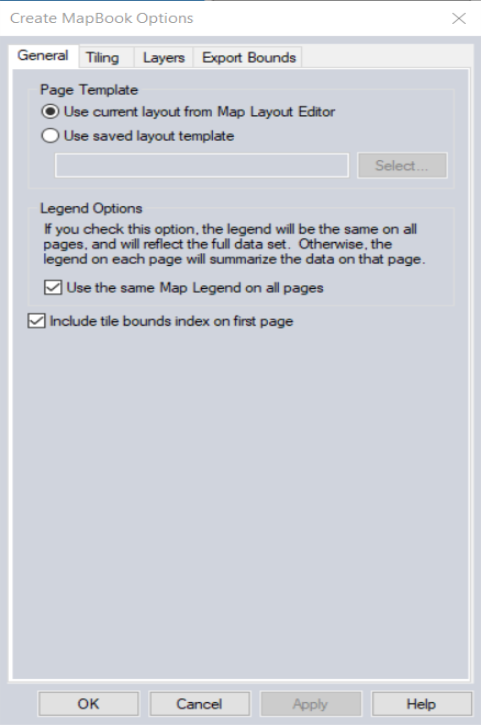 - Create a MapBook from the Map Layout Editor file menu. Choose the layout to use as the template, and what elements to duplicate on every page. The Tiling tab defines how the map data is divided into different pages. The Export Bounds define the extent of the data to be covered by the pages of the MapBook.