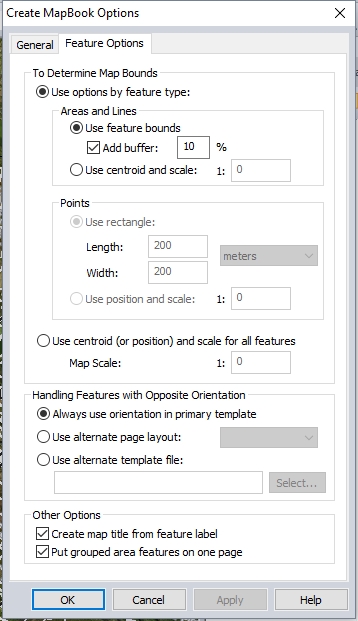 The Feature Options tab contains options related to how the selected features will be used to determine the map bounds and orientation for each page. Each page of the MapBook can have bounds auto-generated based on the extent of the selected features. Alternately, each page can centered on the feature of interest while maintaining the same map scale across each page of the MapBook.