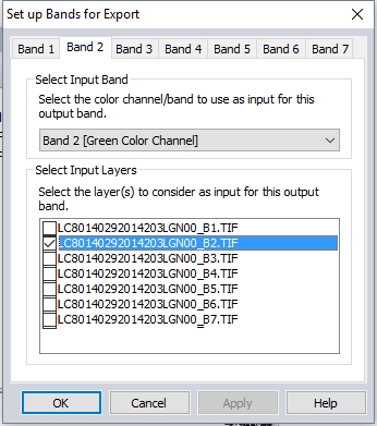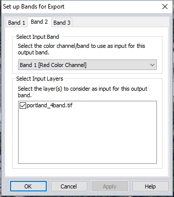 The Set up Bands for Export dialog will appear. Specify which Layer to include in Band 1. Then choose which color channel/ band within that layer will be included in the output band.