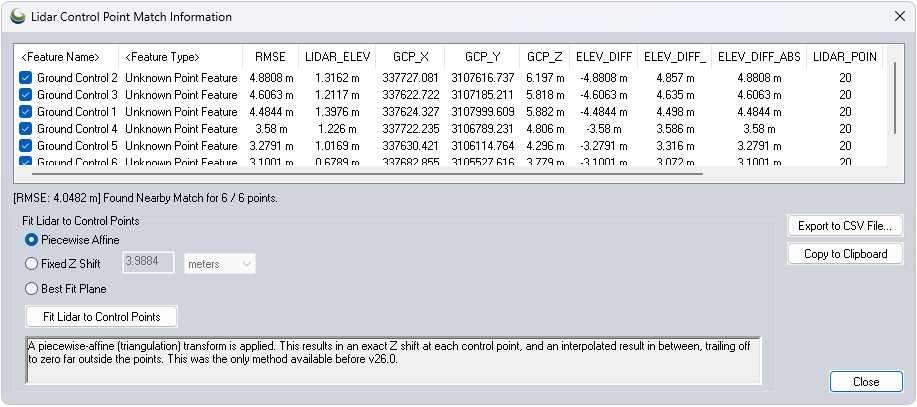 Found Nearby Match indicates the number of control points that had nearby Lidar points for comparison.