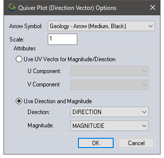 The Quiver Plot (Direction Vector) Options dialog (below) allows the user to specify the arrow symbol and attributes to be used when displaying point data as a quiver (arrow) plot. The arrow will point in the direction calculated from the attributes. The size of the arrow will be scaled relative to the largest magnitude value. If no magnitude is specified, all of the arrows will be the same size.