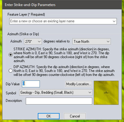After selecting the location of the strike-and-dip point, the Enter Strike-and-Dip Parameters dialog (pictured below) appears. If necessary, set the Azimuth angle for the strike, then specify if it is relative to True North (the default), Magnetic North, or Top of Map/ Screen(grid North) and if it represents a strike azimuth or a dip azimuth. Then set the Dip value for the point (which will be used as the display label on the map), the symbol to use, an optional description, and which layer in the Control Center to place the new point feature.