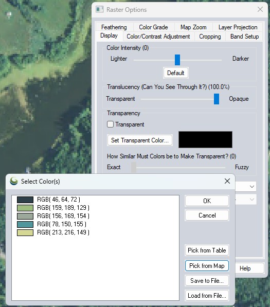 With other raster files, the Transparent color list will be empty to begin with. Use the Pick from Map or Pick From Table buttons to add colors to the list. Highlighted colors will be set at transparent. Use the SHIFT or CTRL keys to highlight multiple transparent colors once picked.
