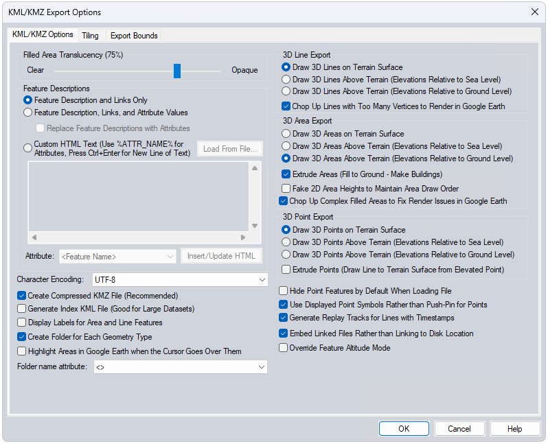 Replace Feature Descriptions with Attributes - when enabled, Global Mapper will not export the Feature Description field, and instead will only export the information from the attributes. This prevents attribute duplication when exporting from an existing .KMZ.