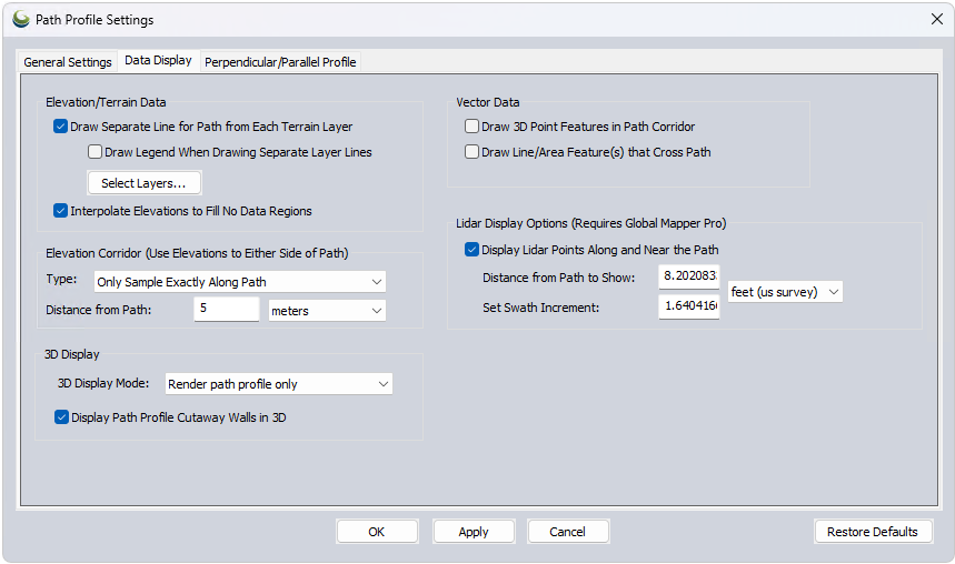 Display Lidar Points Along and Near the Path - This option requires Global Mapper Pro. Checking this option will allow point cloud data to be displayed within the Path Profile view.