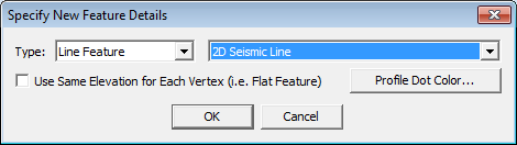 When the Perpendicular Profile Extraction button is pressed, the Specify New Feature Details dialog will appear. This dialog also appears when pressing Add... from the Perpendicular Profile Extraction window. Determine the geometry type and the Feature Type using the drop downs. Once the new feature has been defined, click the vertex location in the Path Profile view to place the first vertex for the feature.