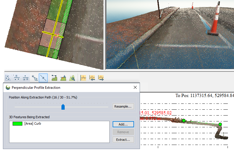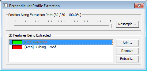 The Perpendicular Profile Extraction dialog shows the position along the extraction path, marking the location of each perpendicular profile. The dialog also manages the creation and extraction of 3D feature. Step through the subsequent path profiles using the slider, left and right arrow keys on the keyboard, or the