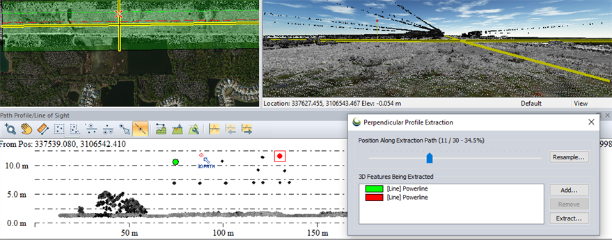 For Linear features, create a Path Profile following the length of the linear feature. Enable the Perpendicular Profile view and determine the best Perpendicular Path Length to use for the Profile view. Also set the Max. Distance from Path to Show [Perp] if using Lidar data.