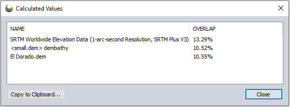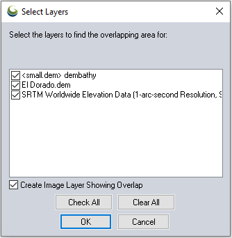 Selecting this option will open the 'Select Layers' dialog, here all loaded Lidar/point cloud, raster and gridded terrain layers will populate in a list. Select those you would like to find overlap between.