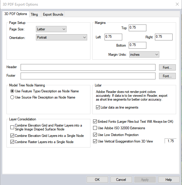 Lidar Data as Line Segments – Check this option to draw the lidar points as short lines in the export. This produces a more usable view of the 3D point cloud in the export than points that are very tiny in the Adobe 3D viewer.