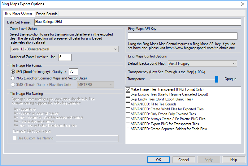 When the Bing Maps output is selected from the File > Export Web Format menu, the Bing Maps Export Options dialog (below) appears, controlling setup of the export.