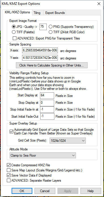 The KML/KMZ Export Options panel allows the user to set up the target image format for storage and the sample spacing, as well as other options such as whether to store all of the resulting files in a KMZ file (recommended) and whether or not to render and save loaded vector data.