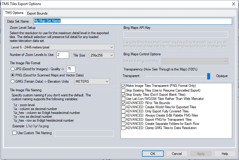 - Make Image Tiles Transparent (PNG Format Only) - This option will make the background of the tile transparent, rather than the color of the map background. Only PNG files support transparency (it is not supported in JPG format), so the Tile Image File Format must be PNG for this to take effect.