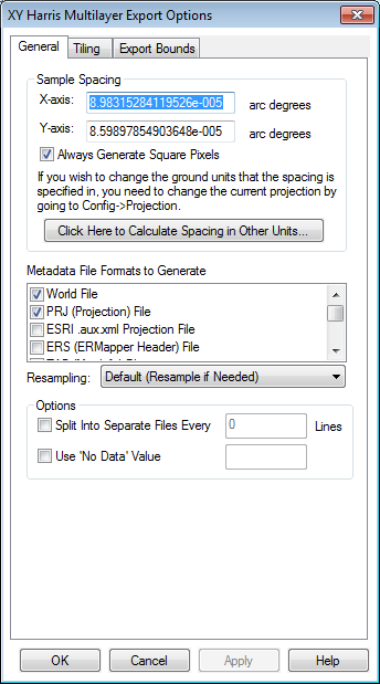 The Sample Spacing section allows the user to select the grid spacing to use when generating the file. The default value is the average of the grid spacings of all the currently loaded raster and elevation overlays.