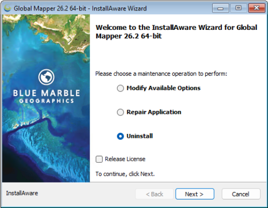 When uninstalling Global Mapper, select Uninstall and check the box to Release License.