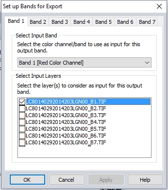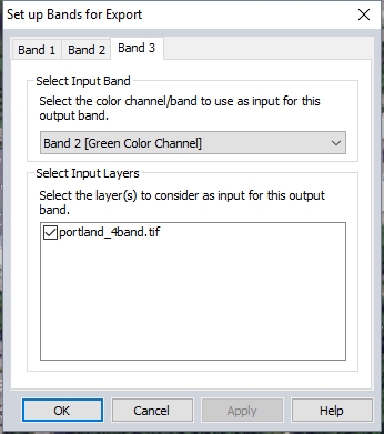 The Set up Bands for Export dialog will appear. Specify which Layer to include in Band 1. Then choose which color channel/ band within that layer will be included in the output band.