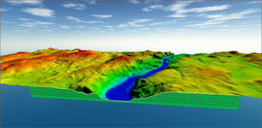 Cutaway views can also be used with draped imagery on top of the terrain or loaded 3D vector features.