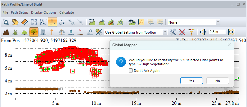 A window will pop-up verifying that selected points are to be reclassified to the indicated class. To finish reclassification, click the 'Yes' button.