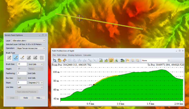 This function provides the ability to use the Terrain Paint tool within the Path Profile window, allowing you to change elevation values in raster data from a perpendicular perspective.