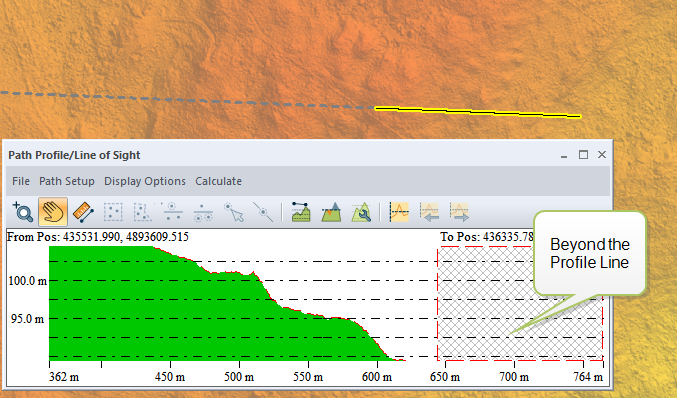 On the 2D map view, the yellow line will shrink to represent the extent of the current profile graph. Sections of the profile line outside of the current path profile graph extent will be shown with a dashed gray line.