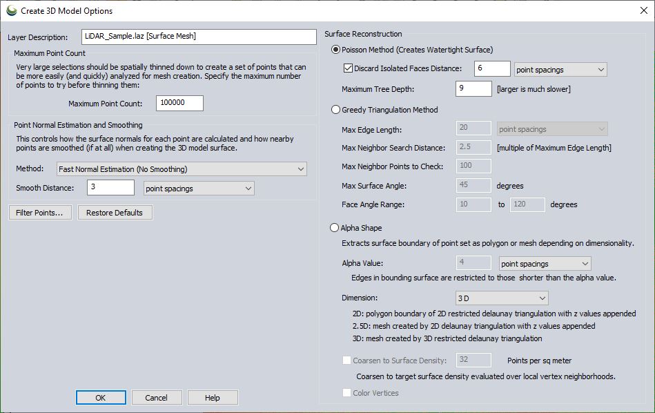 Specify the maximum number of points to attempt to mesh. The tool will perform 3D thinning on the point cloud if the selection is larger than the maximum. This allows for mesh generation of larger sections of point clouds.