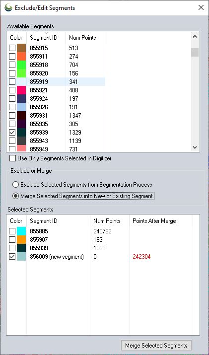 When this option is enabled theSelected Segments list will show the selected segments along with a new segment ID containing zero points. In the Selected Segments section enable the check box for the segment ID you would like to keep and click Merge Selected Segments to assign all the points in the Selected Segments to the checked segment ID to keep.
