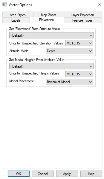 The drop-down list will include available attributes, plus an entry for <Default>. If <Default> is chosen, then Global Mapper, when rendering a 3D point symbol, will scan the attributes for one of a small set of candidate attribute names that could work (e.g. "HEIGHT", "DEPTH", "HGT", "HEIGHT"), and if it finds one, will use that. If <Default> is selected Global Mapper will scan the height attribute candidate list. If a specific attribute is used to designate elevation, attribute candidates will be skipped in favor of the user-specified elevation attribute.