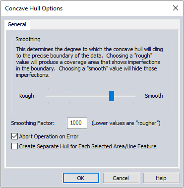 The smoothing slider determines how precisely to follow the edge of features to contain them. A rough concave hull will typically include more vertices and may contain more concave sections. A smooth hull with simplify the boundary to generate a less complicated bounding feature. Use the slider or enter a value to determine the smoothing factor. Any value above zero is valid, larger values will create smoother areas while lower values will create rougher areas.