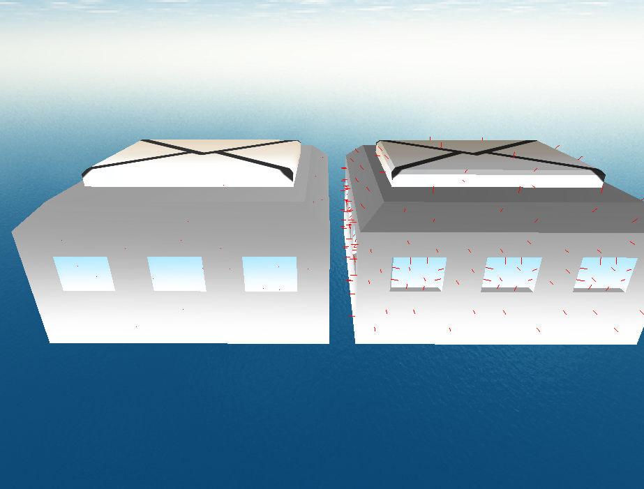 In this example the model on the left has had the faces reversed. With a structure like this, the effect is the turn the model inside out, so the textures ar facing the inside rather than the outside. The shadowing of the windows appears on the inside instead of correctly on the outside like in the original model on the right. Also note the differences in the roof. The second image displays the models with face normals shown in red vectors. The third image displays these models also with backface culling enabled. The walls closest to the camera have disappeared in the model to the right, because the camera is looking at the backside of the face now that the face has been flipped.