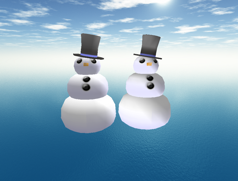 In this example, the snowman on the left has had the normals reversed, so that the shading of the lower two snowballs is darker and shadowed, compared to the original model on the right, where the bottom two snowballs are highlighted. The second image shows the models with Vertex Normal display enabled. The blue vectors point into the model on the left (where the vertex normals have been flipped), and point out of the model on the right, which would be a more typical face orientation for a 3D object such as this.