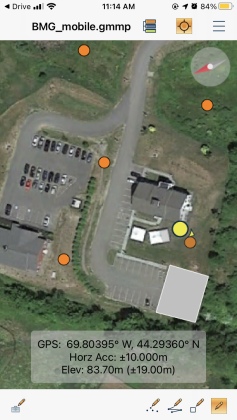 The Latitude and Longitude are displayed on the bottom of the screen. The location information will also report the elevation and accuracy.
