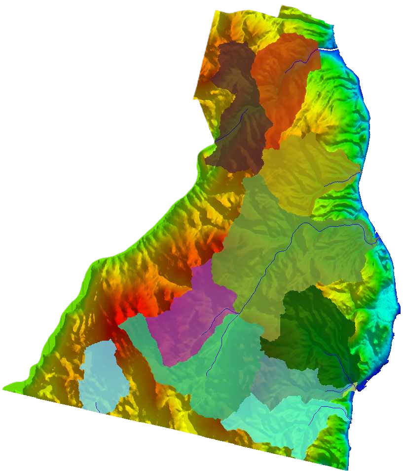 Performs a watershed calculation on the loaded terrain layers, generating a stream network and optionally a set of drainage area features for each stream. There is also a way to find ridge lines rather than generating a stream network. The returned stream and drainage layers must be closed with CloseLayer when you are done with them.