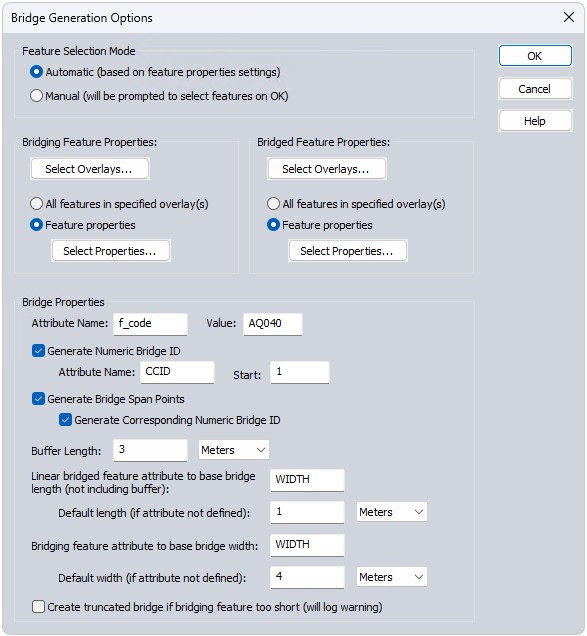 Automatic– The bridge generation tool will process all features that meet the criteria specified in the Bridging Feature Properties and Bridged Feature Properties groups.