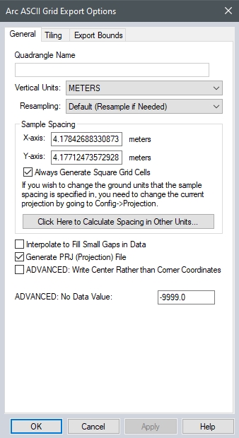 When selected, the command displays the Arc ASCII Grid Export Options dialog which allows the user to setup the export. The dialog consists of a General options panel which allows the user to set up the grid spacing and vertical units, a Tiling panel and an Export Bounds panel which allows the user to set up the portion of the loaded data they wish to export.