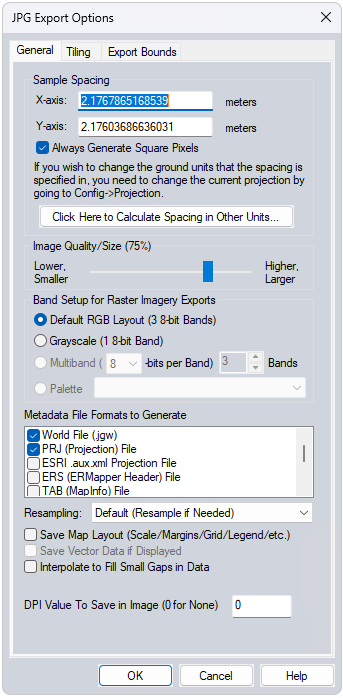 When selected, the command displays the JPG Export Options dialog which allows the user to setup the export. The dialog consists of a General options panel which allows the user to set up the pixel spacing, a Tiling panel, and an Export Bounds panel which allows the user to set up the portion of the loaded data they wish to export.