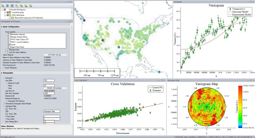 The Variography and Kriging tool, accessed from the Vector Analysis Menu, creates variograms to perform geostatistical analysis in order to estimate continuous values from a dataset. This tool works with point cloud data and vector point data, considering one targeted attribute in the variogram plot, statistical analysis, and kriging method. The variography is useful as a data exploration tool outside its usage as an input to kriging estimation. For more information about the statistical formulas used with this tool download the pdf: Geostatistics with Global Mapper.