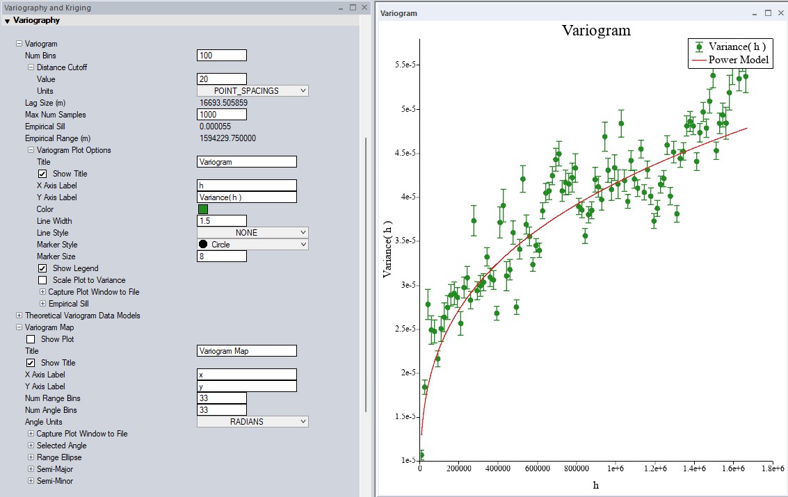 The Variogram will initially be plotted with a theoretical best fit model. Changing the parameters will automatically adjust the displayed model. Once the Variogram has been displayed, the Theoretical Variogram Data Models and Kriging sections of the dialog will become visible.
