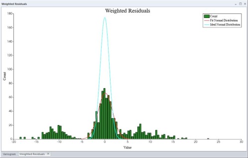 Weighted Residual - It is the uncertainty in the measurements at different locations. The weighted residual is the residual divided by the square root of the Kriging variance. A lower weighted residual isn’t necessarily better, it could mean that the uncertainty is overestimated. The fundamental statistical test here is to check that the weighted residuals are normally distributed with zero mean and unit variance.